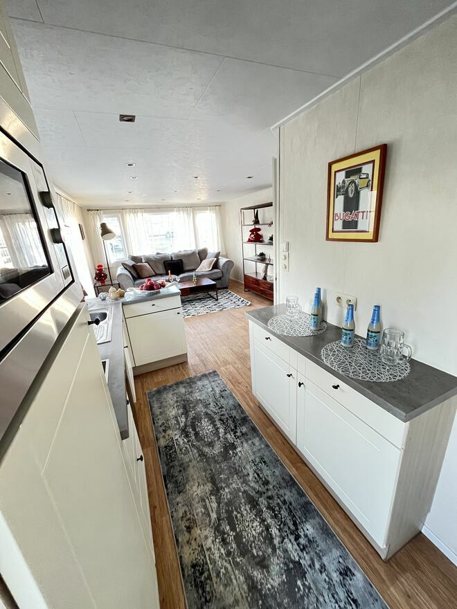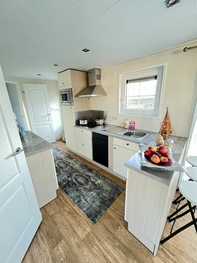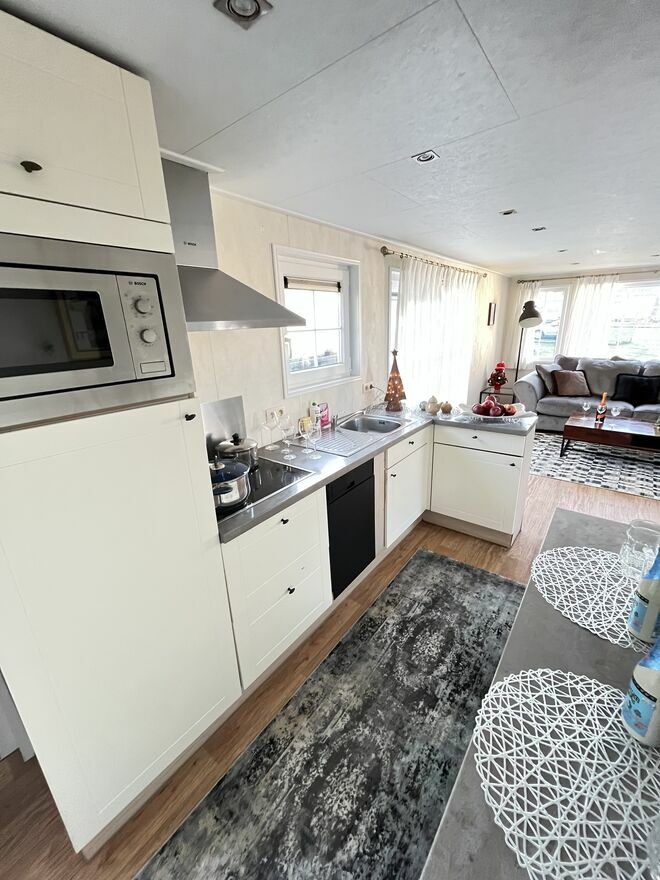 -KUCHNIA: szafki do przechowywania, zlew jednokomorowy z ociekaczem , płyta indukcyjna, okap, lodówka w zabudowie, zmywarka, mikrofalówka, trzy taborety