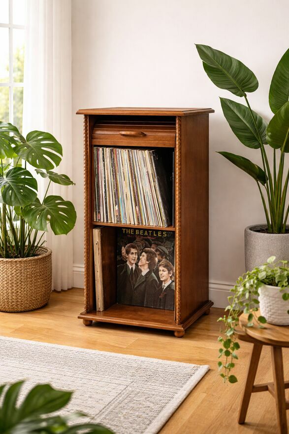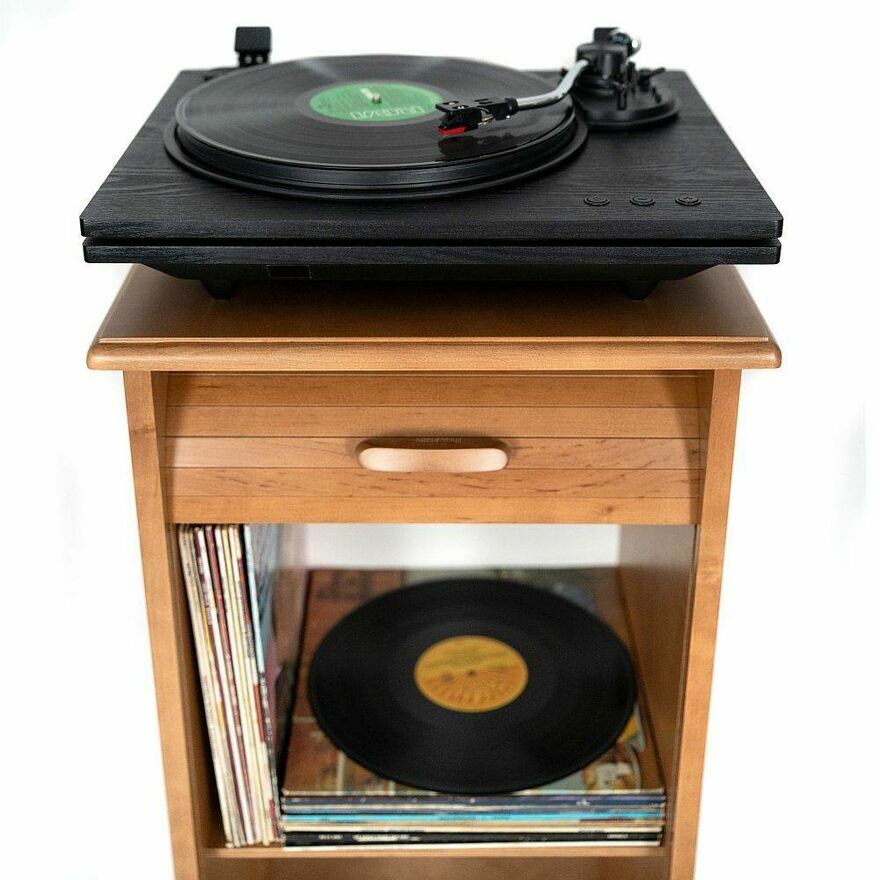 Drewniana szafka na winyle i segregatory